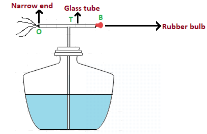 從圖中我們可以看到,在噴槍裝置中,我們有一個(gè)橡膠燈泡(用“B”表示)、一個(gè)窄玻璃管(用“T”表示)和末端的窄孔(用“O”表示)。