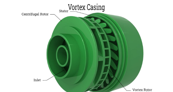 該外殼是一個(gè)圓形腔室,位于外殼和葉輪之間。來(lái)自葉輪的流體必須先通過(guò)渦流室,然后再通過(guò)蝸殼。速度能量已轉(zhuǎn)化為壓力,與蝸殼相比具有良好的效率。
